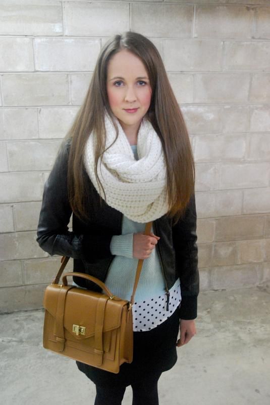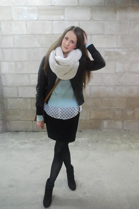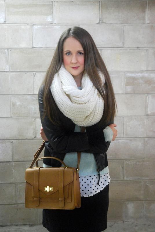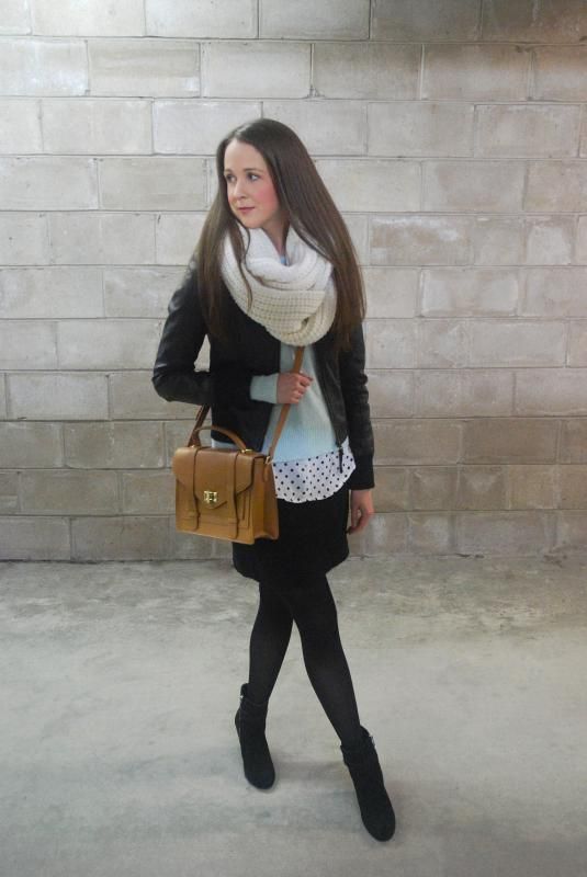 Featured Items: Faux Leather Jacket: Winners | Chunky Knit Scarf: c/o Banana Republic | Sweater: Smart Set (current) | Blouse: Dynamite (similar) | Skirt: Tommy Hilfiger (old, but love this one) | Tights: H&M | Boots: c/o Vince Camuto | Crossbody Bag: Forever 21 (current) |