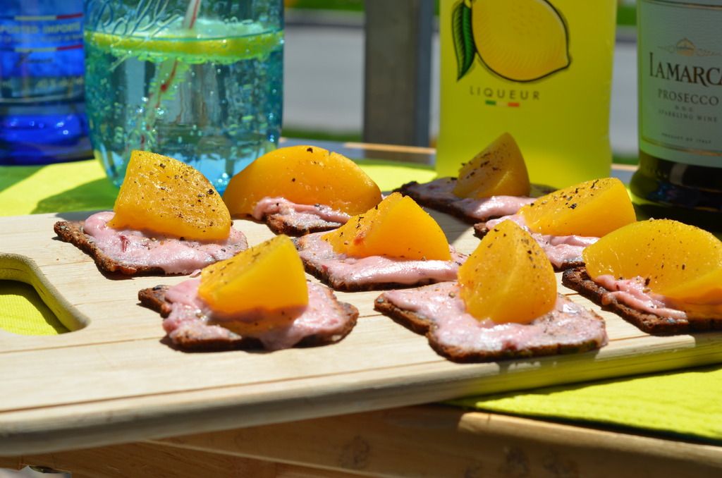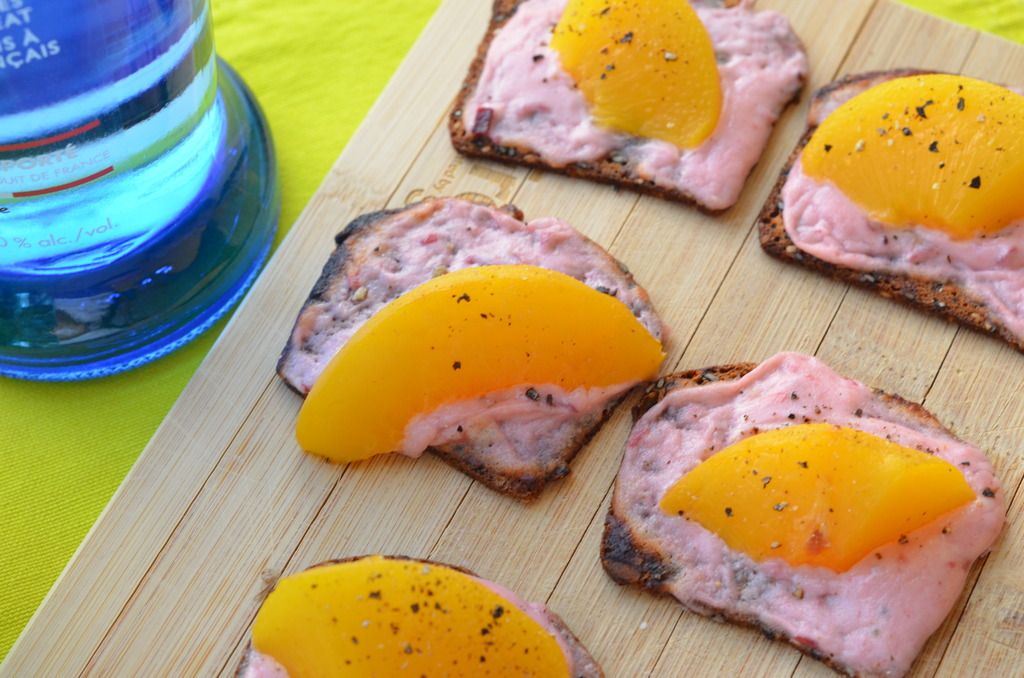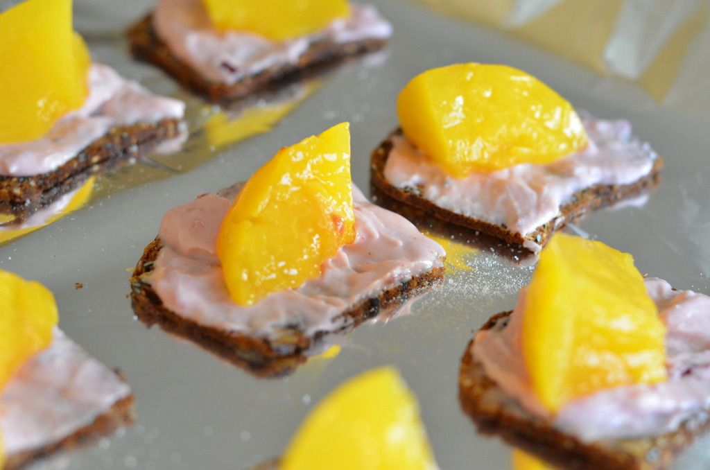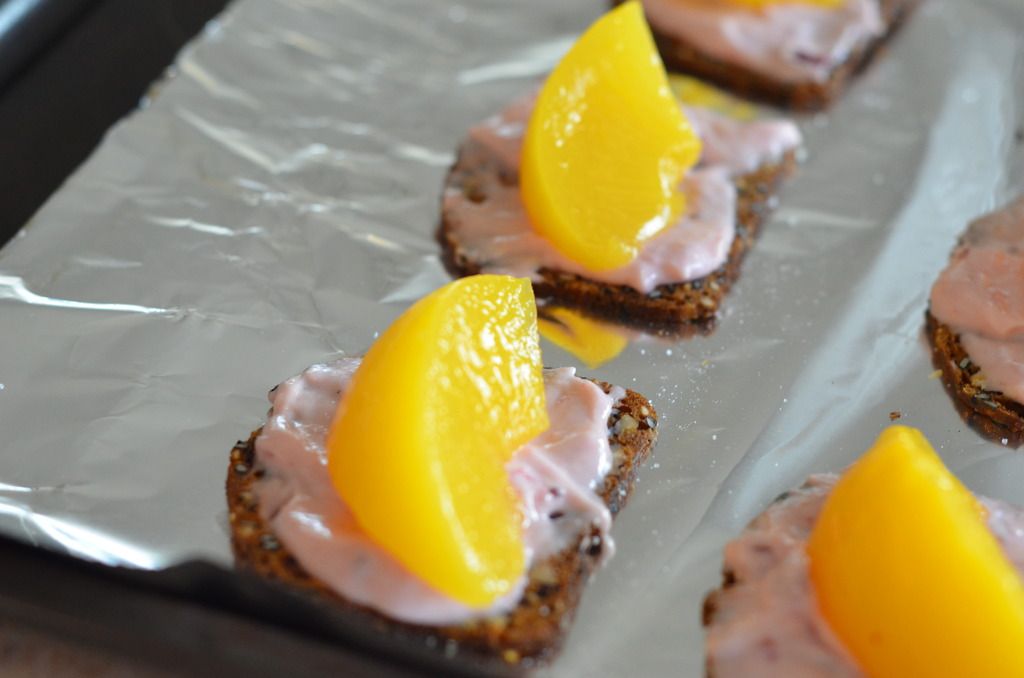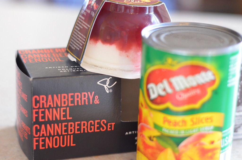 Because I'm lazy I decided to use my favorite artisan crackers from the Super Store (the black currant ones are really great too) instead of dealing with the toast (but this could easily be turned into a delicious lunch too if you did decide to use the bread. To further my laziness or convenience I also used canned peaches because (a) they aren't in season right now and (b) I couldn't even find frozen ones. I can't wait until August, not only because it's my BIRTHDAY, but because that's when peaches are back in season.