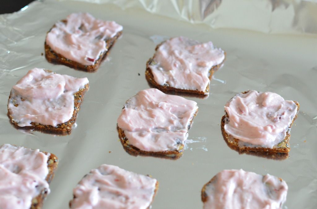 Spread cheese mixture on each piece of cracker/baguette all the way to the edges (so the toast doesn't burn under the broiler), and the entire piece is covered.